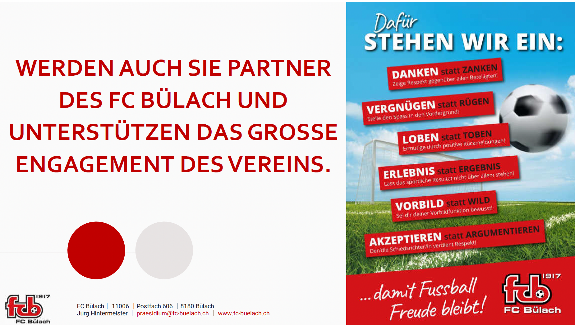 Diese Basis der Sichtbarkeit als Marken- und Firmenbotschafter, bietet Ihnen der FC Bülach in verschiedenen Partnerschafts-Modellen. Werden Sie Partner des FC Bülach, und unterstützen Sie das grosse soziale und sportliche Engagement des Vereins.